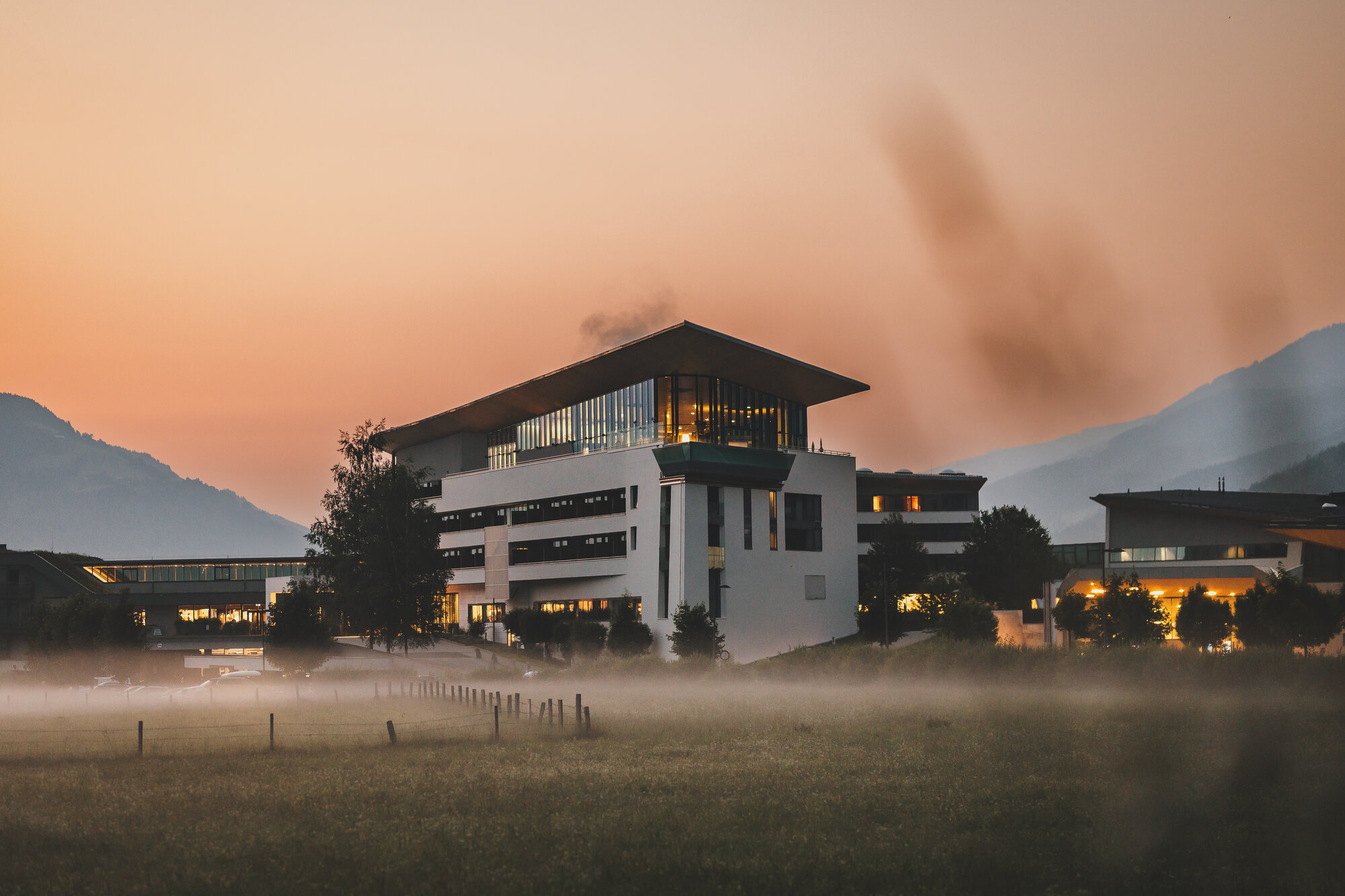 - Hotel vor Bergpanorama mit schneebedeckten Gipfeln und Wolken im Tal